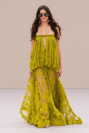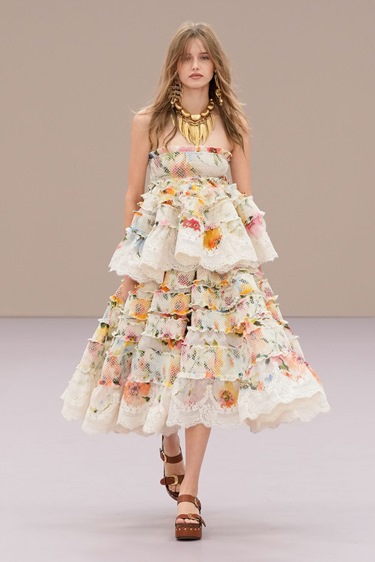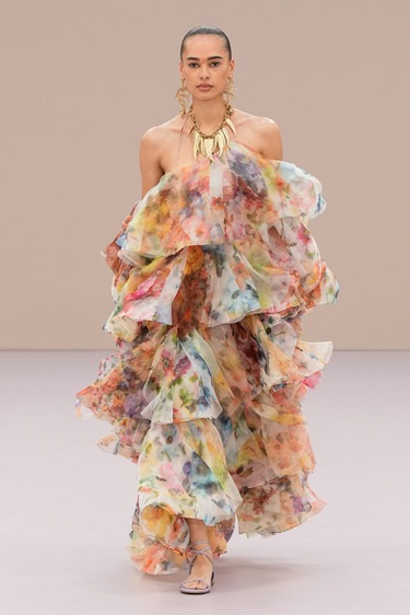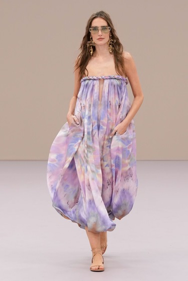 افتُتح العرض بتصاميم طُبعت بأزهار مشوّهة وخطوط لونية متماوجة بدت كأنها تذوب تحت الأضواء. التنانير الكرِنولينية التي طالما ارتبطت بالحنين إلى الماضي أخذت هنا بُعداً مختلفاً بفضل طبقات من التول المنفوخ المحبوك بخطوط صلبة، مما أضفى على الأشكال التقليدية حيوية جديدة مشوبة بالغرابة. أما الفساتين عارية الكتفين الواسعة فانسابت بخفة أشبه بالمظلات الملوّنة، مزيّنة بتدرجات مستوحاة من غروب البحر، وكأنها تعكس المشهد الذي ألهم فناني لافندر باي في تلك الحقبة. هنا بدا واضحاً كيف توظف زيمرمان موهبتها في خلق إحساس "بالهواء والحركة"، لتجعل الثوب نفسه وكأنه يتنفس أو يطفو.