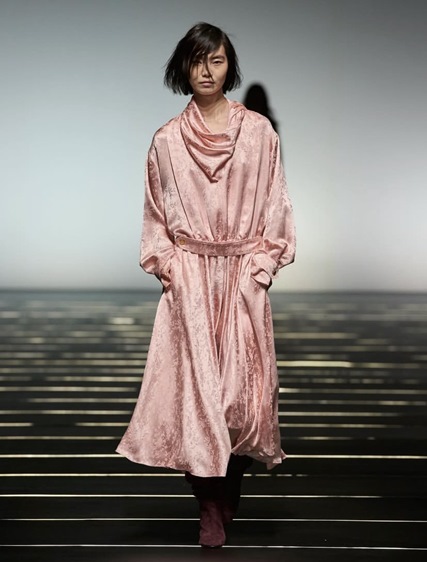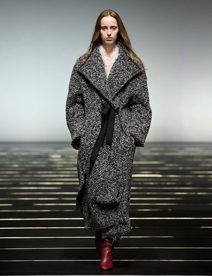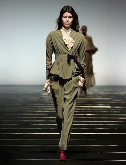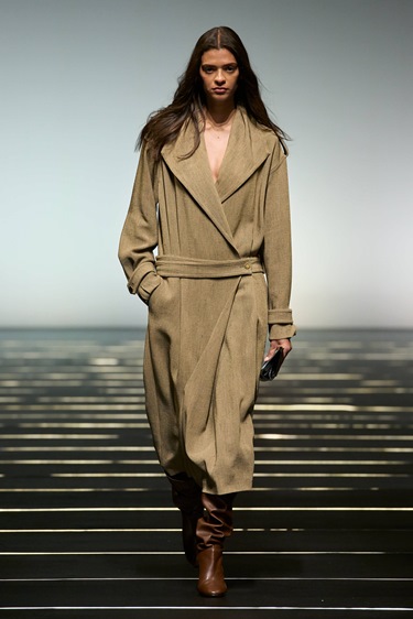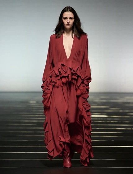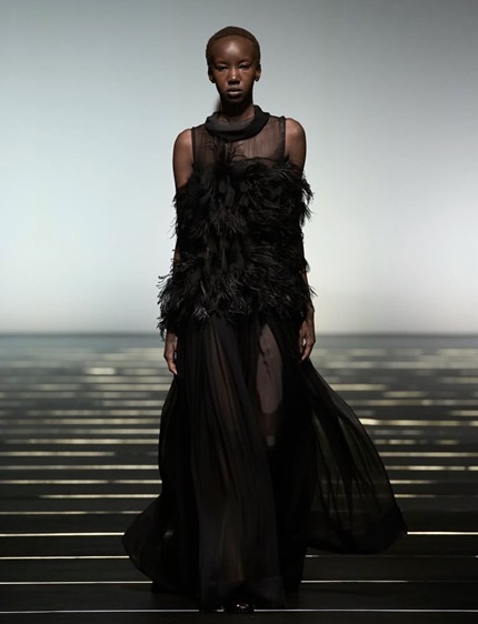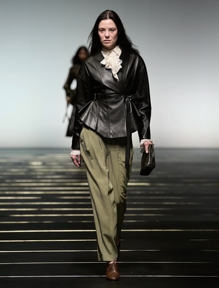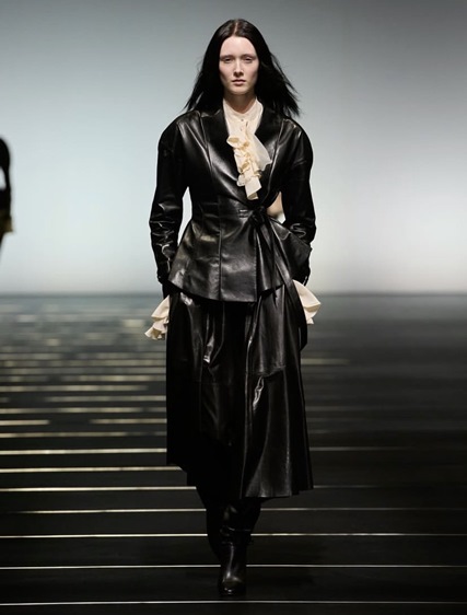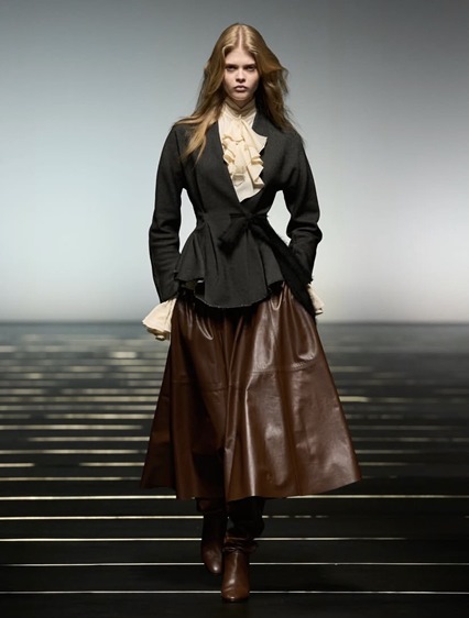 أما النهار، فجاء مشبعاً بإيحاءات العصر الفيكتوري، من خلال اللعب على التناقض بين الأنثوي والذكوري، والبنية والإنسيابية. السترات الملتوية والتصاميم الجلدية الأنيقة قابلتها قمصان شفافة مزمومة وسراويل بثنيات مريحة، في حوار بصري يعكس قوة ناعمة لا تحتاج إلى مبالغة. استخدام جلود الحمل والأنقليس، مع معالجات تشبه الشيبوري، أضفى عمقاً ملمسياً على التنانير الضيقة والمعاطف، فيما أكملت الأحذية المسطحة والبوتات المترهلة صورة عملية ومدروسة.