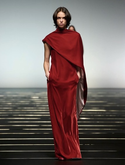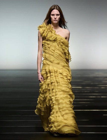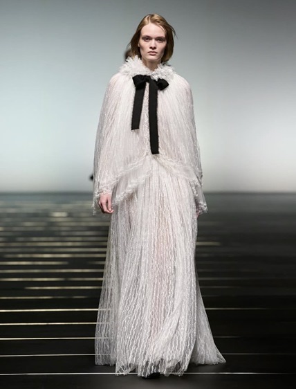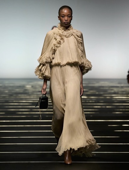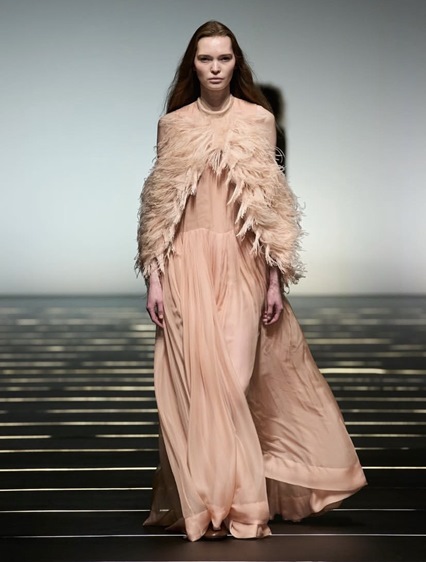 على مستوى التصميم، حملت المجموعة توقيع "الرومانسيين التقدميين" الذي أرساه سيرافيني منذ ظهوره الأول مع الدار. في فساتين السهرة، بدت الشيفونيات المتطايرة وكأنها تتحرك مع الهواء أكثر مما تمشي على المنصة، مع لمسات مدروسة من ريش النعام، والتطريزات المخرّزة، والأسطح اللامعة التي أضافت بُعداً زخرفياً ناعماً دون أن تخلّ بالتوازن العام. إلا أن القطع الأبرز كانت الفساتين الكاب المخملية، بخطوطها النقية وألوانها العميقة مثل الياقوتي والباذنجاني، والتي عكست فخامة صامتة منسجمة مع ذائقة المرأة في المنطقة.