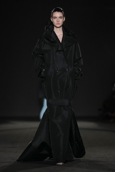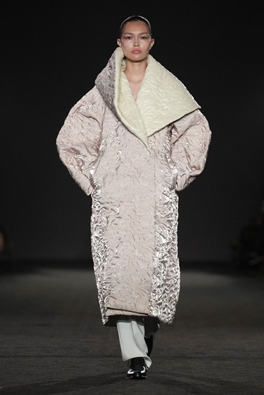 حتى المعاطف المبطّنة الني تشبه الألحفة حملت أثراً من فكرة الزيّ الديني، لكن من دون صرامته. بدت كطبقة حماية، كاحتضان قماشي يمنح الجسد دفئاً معنوياً قبل أن يكون مادياً. هنا، أعاد غورونغ تعريف مفهوم الزيّ الموحّد: من رمز للانضباط والطاعة إلى مساحة شخصية للراحة والاحتماء. التناقض بين الدانتيل الرقيق والخياطة الحادّة، بين الصرامة والاحتواء، خلق توتراً بصرياً مثيراً، يعكس ازدواجية التجربة بين الطفولة والبلوغ، وبين الخضوغ والرغبة في التحرّر.