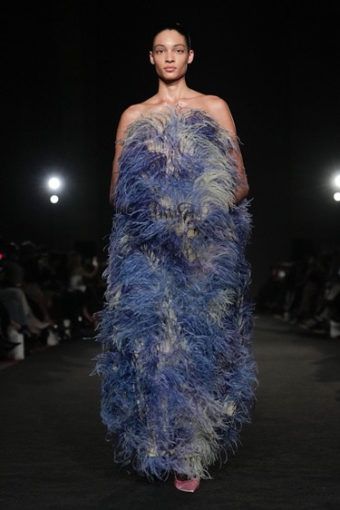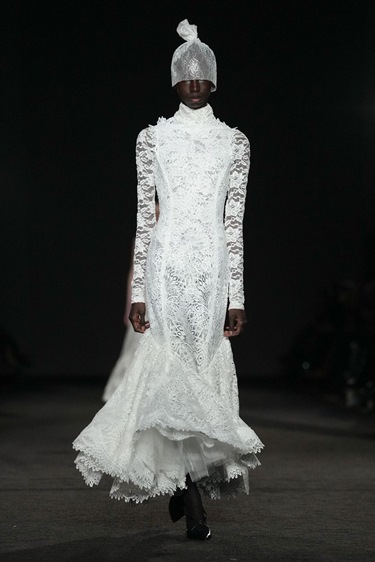 عاد غورونغ في هذه المجموعة من جديد إلى نيبال، إلى طفولة تشكّلت بين المعابد والأديرة وحضور الشامانات، حيث تتعايش أنظمة روحية متعددة من دون تناقض. هذه الخلفية لم تظهر كاقتباس فولكلوري أو زيّ تقليدي، بل مرّت عبر لغته الخاصة في أزياء السهرة. قبعات دانتيل ضيّقة تحجب العينين، بعضها مزيّن بشراريب خفيفية وبعضها أكثر تقشّفاً، استلهمت من أزياء الطقوس، لكنها بدت حديثة ومشحونة بغموض أنثوي. أما الشيفون المنسدل فاستعاد حركة الساري حين يُرفع لتسهيل المشي والرقص، ليتحوّل إلى فساتين تنساب بخفة احتفالية تجمع بين الطابع الطقسي والحسّ الحسي في آن.