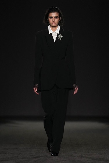 الذاكرة الثانية التي نسجت خيوط المجموعة جاءت من مكان مختلف تماماً: مدرسة كاثوليكية داخلية في بريطانيا، حيث كانت الراهبات يدرّسن غورونغ ويطرّزن الدانتيل بأنفسهن. هذا التفصيل الشخصي تحوّل إلى عنصر بنيوي في العرض. الدانتيل ظهر كحواف رقيقة على بلايزرات محددة القصّ، ثم كنسيج كامل لفستان بخصر منخفض وهيئة شرنقة، ينكشف ظهره بانحدار ناعم يشي بهشاشة محسوبة.