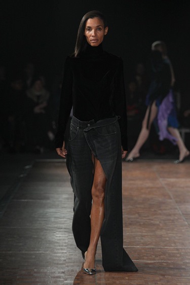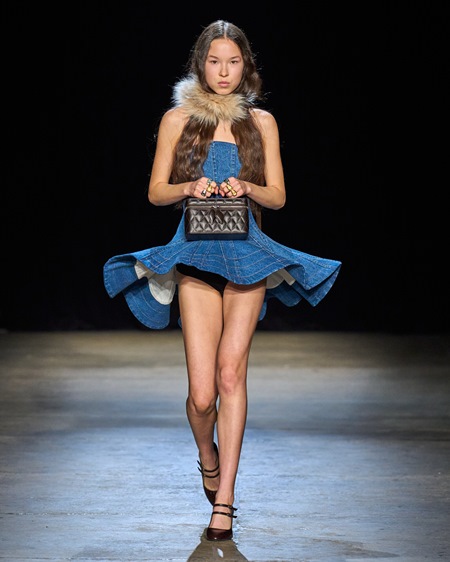 الجديد هذا الموسم جاء من عرض AKNVAS، حيث تحوّل الدنيم إلى مساحة نحت حقيقية. رأينا كورسيهات بلا أكتاف بقصّات محددة تُبرز الخصر، تنتهي بحواف دائرية بارزة تخلق حجماً عند الوركين، وكأنها تزاوج بين الدنيم وفكرة الببل هم. في إحدى الإطلالات، انسدل الجزء السفلي كتنورة قصيرة مفتوحة تكشف عن شورت مطابق، ما أضفى حركة ديناميكية على القماش القاسي بطبيعته. كما لفتني استخدام ياقة فرو عند العنق في بعض الإطلالات، في تباين ذكي بين خامة عملية وأخرى فاخرة. حتى الحقائب الجلدية الصغيرة حملت طابعاً كلاسيكياً يعاكس جرأة القصّات، فبدت الإطلالة متوازنة بين الطرافة والانضباط. هنا، الدنيم لم يكن أساسياً فحسب، بل قطعة عرض بحد ذاتها، تُنافس فساتين السهرة من حيث الحضور البصري.