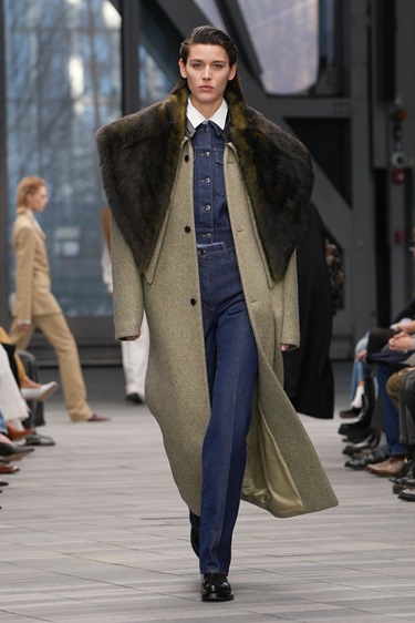 في عرض Tibi، لفتني كيف تحوّل الجينز إلى جزء من معادلة أنيقة أقرب إلى خزانة عمل معاصرة. رأينا بناطيل دنيم بقصّات مستقيمة وواسعة قليلاً، بخصر متوسط وانسيابية مدروسة، نُسّقت مع قمصان قطنية أو كنزات بسيطة بألوان هادئة. أكثر ما أعجبني هو طريقة تنسيقه مع بليزر داكن أو معطف طويل، ما منح الجينز حضوراً راقياً بعيداً عن أي طابع شبابي تقليدي. هنا، الدنيم لم يكن قطعة كاجوال، بل بديلاً حقيقياً عن السروال الكلاسيكي.