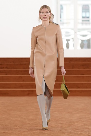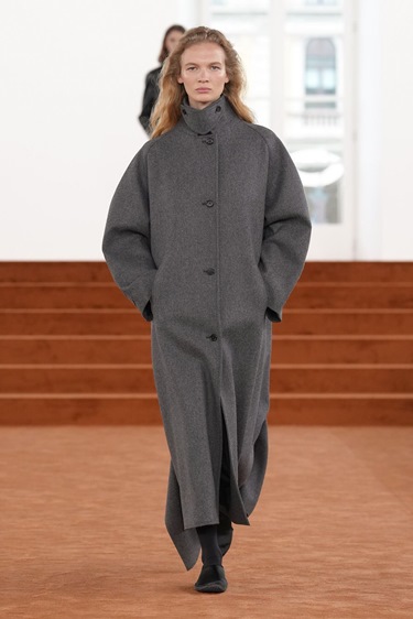 افتُتح العرض بثلاث إطلالات بدت وكأنها تحية مباشرة إلى جيل ساندر: بدلات واسعة بصدر واحد ومعاطف نظيفة الخطوط، يمكن بسهولة أن نتخيّلها في أرشيف التسعينيات. سترة كحلية طويلة فوق قميص أبيض بسيط، ياقة مفكوكة قليلاً، تفصيل صغير كفيل بأن يعلن أن الكمال هنا ليس الهدف، بل الإنسانية.