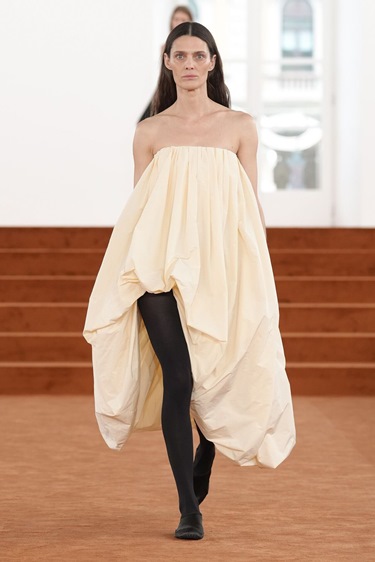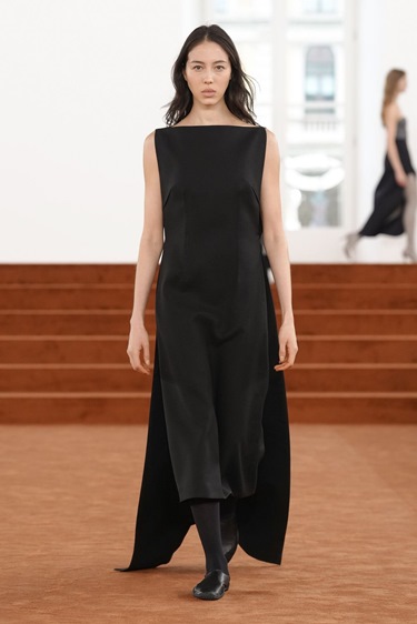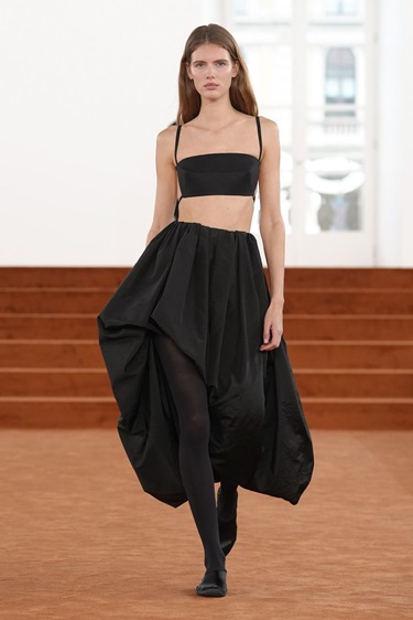 بلغت المجموعة ذروتها مع فساتين وتنانير باراشوت بالأبيض والأسود، تحوّل فيها التقشف إلى حركة وانسياب. الأقمشة خفيفة، الخطوط نظيفة، لكن الإحساس لم يعد بارداً. على العكس، كان هناك دفىء داخلي، كأن الحد الأدنى تعلّم أخيراً كيف يبتسم.