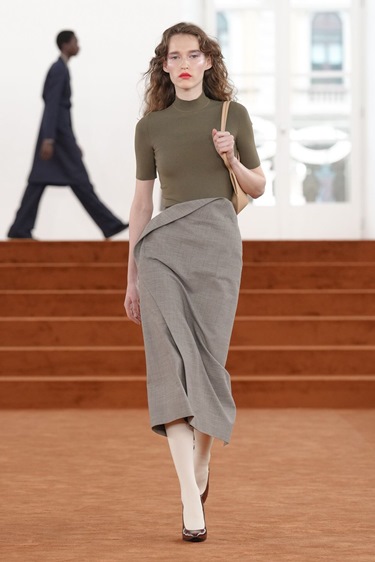 القصّات بقيت حادة، لكن البنية أصبحت أكثر ليونة. معاطف مزدوجة الأزرار أُغلقت أعلى الصدر لتعطي هيئة مستقيمة وقوية، فيما تنانير من قماش البدلات شُقّت جانبياً لتسمح بالحركة. المعادلة واضحة: انضباط بصري، لكن من دون قسوة. حدّ أدنى يتنفس.