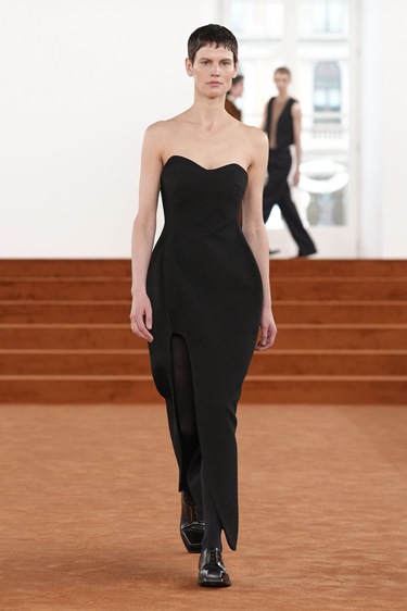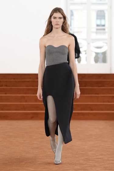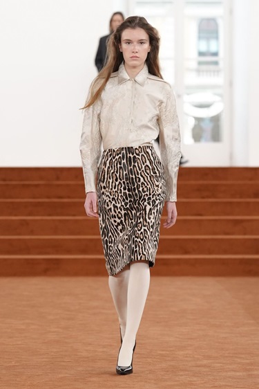 الشقوق التي ميّزت عرضه الأول، والمستوحاة من أعمال فونتانا، عادت لكن بزاوية مختلفة، أفقية هذه المرة على تنانير بقصة A-line مشقوقة من الفخذ حتى الركبة. حركة بسيطة في البناء، لكنها كافية للإشارة إلى أن السرد يتغير. هناك حرية أكبر، وانفلات مدروس من الصرامة.