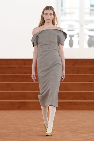 إذا كانت البداية وفية للأرشيف، فإن منتصف العرض كشف عن شخصية بيلوتي بوضوح أكبر. ظهرت عارضة الدار التاريخية جينيفير فان سينوس بفستان مكشوف الكتفين يلتف حول الجسد كملاءة سرير، في صورة تجمع بين البساطة والحسية. هنا تحديداً بدأ المصمم يوسّع الجدران.