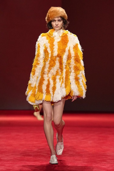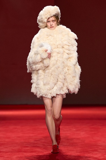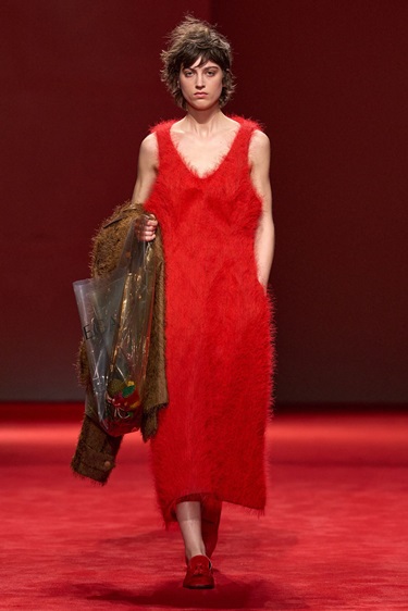 في المقابل، أعادت البدلات المصقولة والمعاطف المبطنة بالفرو المصقول بعض الانضباط، فيما ظهرت حقيبة جاكي بنسخة جلدية أكثر ليونة وأقل رسمية. تحت عنوان “Gucci Primavera”، بدت المجموعة أقرب إلى فعل انطلاق منها إلى موسم عابر؛ إعادة ضبط تستهدف الإحساس الفوري بالعلامة، لا تأملها من مسافة.