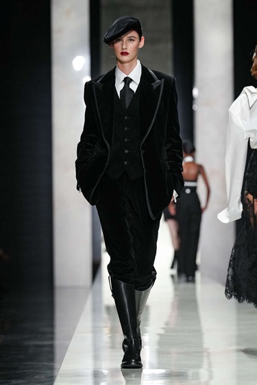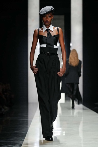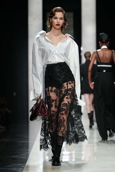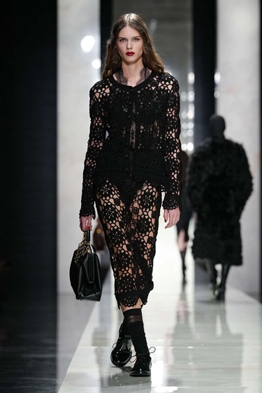 التحوّل الأبرز تمثّل في العودة إلى دقة الخياطة الصقلية التي ميّزت البدايات. سترة الساعة الرملية عادت بطلة للمشهد، بخصر مشدود بانضباط معماري. غير أن المفاجأة كانت في الظهر، ياقة مكرّرة، صف أزرار معكوس، وبنية تمتد على طول العمود الفقري. الخياطة هنا تُشاهَد من كل الزوايا، لذلك توقفت العارضات في منتصف المنصة ليدُرن ببطىء، في تحويل للحرفة إلى أداء. وقد لعبت النسب دوراً استراتيجياً. سترات مزدوجة الصدر بقصّات رجالية كاشفة عن ومضات دانتيل تحتها، في حوار محسوب بين الصرامة والإغراء. الأسود هيمن تقريباً بالكامل، لا كاتجاه موسمي بل كخيار تقشّفي يسلّط الضوء على القصّة قبل الزخرفة. ولاحقاً، كسرت فساتين بطبعات ميكرو رتابة اللون الواحد، مستحضرة لغة تصوير سبعينيات القرن الماضي حيث تتبدّل ديناميكيات النظرة بين الرائي والمرئي. المرأة هنا ذات فاعلية، لا موضوعاً للعرض.