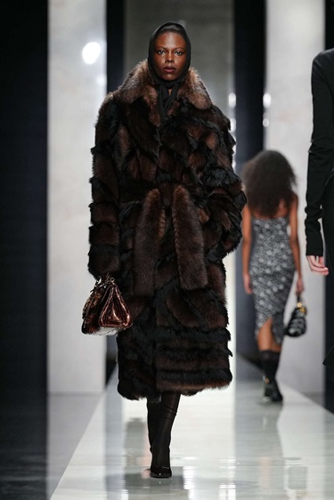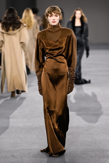مع تقدّم العرض، تحوّلت الخامة إلى بطل أساسي. معطف البحّارة تحوّل إلى مختبر تجارب: جلد تمساح مطفأ، جلد منسوج بتقنية الإنتريتشياتو يتدلى بشراريب، ومخمل كثيف محفور ليحاكي الأستراخان. تروتر لعبت على الإيهام البصري، فقلّدت الفرو والجلود النادرة من دون استنساخها حرفياً، محافظة على مركزية الجلد في هوية الدار. حتى القصّات الضخمة التي غلّفت الجسد بدت خفيفة في حركتها، بفضل هندسة داخلية دقيقة.