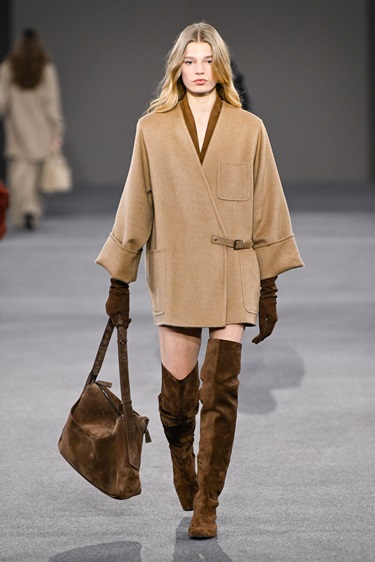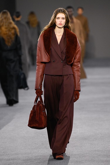 الخامة أدّت دور السرد. شيرلينغ كثيف، وصوف متين، وجلد سويد مصقول بدرجات ترابية دافئة، وكأن القطع خُلقت لتشيخ بكرامة. الفكرة توازي بين القطع الأثرية المتآكلة وجمال الباتينا، وبين فلسفة الدار القائمة على الاستدامة البصرية والعملية. الأحجام بقيت محتضِنة، تمنح إحساساً بالحماية والسلطة. الأكتاف المستديرة في بوليرو الشيرلينغ والفساتين المحبوكة لمّحت إلى ثمانينيات القوة، وهو عقد حاضر بقوة هذا الموسم في ميلانو. الإشارة الزمنية لم تتوقف هنا: عام 1081 ارتبط بمحطة مفصلية في حياة ماتيلدي، فيما شهد 1981 إطلاق معطف 101801 الشهير من تصميم Anne-Marie Beretta، أيقونة الدار المزدوجة الصدر بأكمام الكيمونو، التي لا تزال معياراً للأناقة العملية.