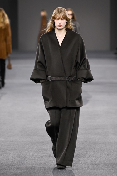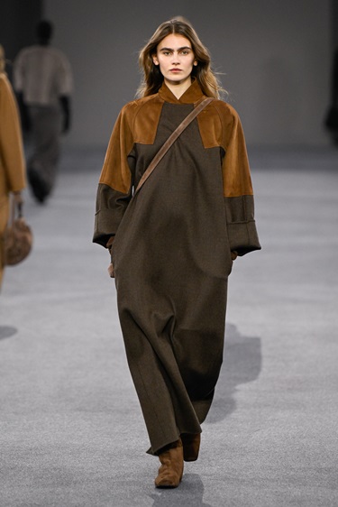المجموعة بُنيت على ثنائية واضحة: صرامة بروتالية تخفي حسية داخلية. هذا التوتر انعكس أولاً في الخياطة، أكتاف مستديرة أكثر ليونة مقارنة بالعرض السابق، وأحجام منحوتة لا حادة. سراويل واسعة وتنورات ملتفة عُلّقت بأحزمة جلدية عريضة، في استعارة مباشرة من هندسة الحقائب التي تشكّل جوهر هوية الدار. في أزياء الرجال، تكرّست الخطوط المنحنية ذاتها، بينما أضافت طبقات البولو والكنزات القصيرة المضلعّة نفَساً عملياً خفّف من رسمية المشهد.