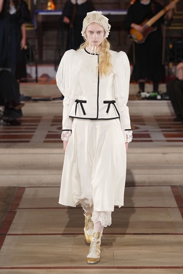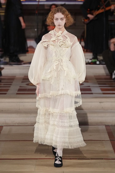 الياقات المرتفعة المستوحاة من العصر الإليزابيثي شكّلت صيحة ثانية لافتة. لدى Simone Rocha وErdem، ارتفعت الكشكشات حول العنق لتؤطر الوجه وتمنحه حضوراً درامياً. بعض الدور عززت هذا الاتجاه عبر عقود عريضة وطبقات من السلاسل فوق القماش، لا تحته، في دعوة واضحة إلى إبراز منطقة الوجه والرقبة كمساحة قوة. هذه الياقات، رغم جذورها التاريخية، بدت قابلة للارتداء اليومي حين نُسّقت مع شعر غير متكلف وأحذية جلدية قوية.