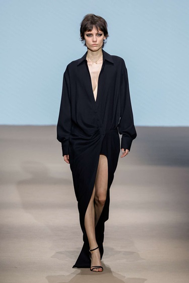 أما من ناحية القصّات، فقد بدت الأحجام مدروسة لكن غير تقليدية، إذ ظهرت بعض القطع وكأنها مشدودة أو مطوية بطريقة معمارية تضيف بعداً نحتياً للتصميم. الأقمشة نفسها بدت كأنها تحمل أثراً للحركة، ما جعل الملابس تتفاعل مع الضوء والجسم بشكل لافت، وتتحوّل مع كل خطوة إلى مشهد جديد.