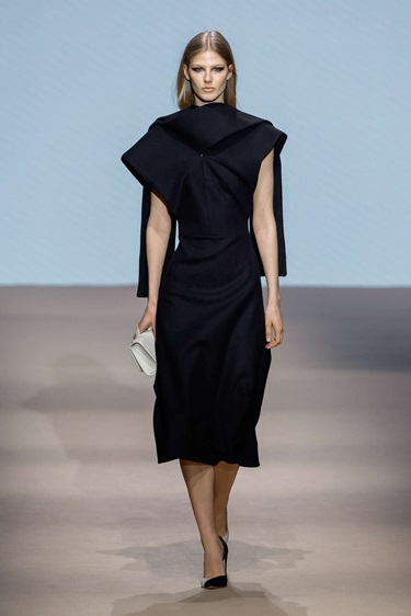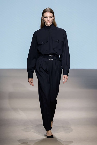 المجموعة تستعيد روح الدار التي عُرفت بالحدّ الأدنى الوظيفي في التسعينيات، لكن برؤية أكثر حداثة تميل إلى الطابع المعماري. الخطوط النظيفة والأحجام المدروسة شكّلت العمود الفقري للتصاميم، فيما هيمنت الأسود كلون رئيسي يبرز البناء ويمنح القطع حضوراً قوياً وراقياً. الفكرة هنا لا تقوم على البساطة السطحية، بل على أناقة منضبطة تستند إلى القصّة والبنية أكثر من الزخرفة.