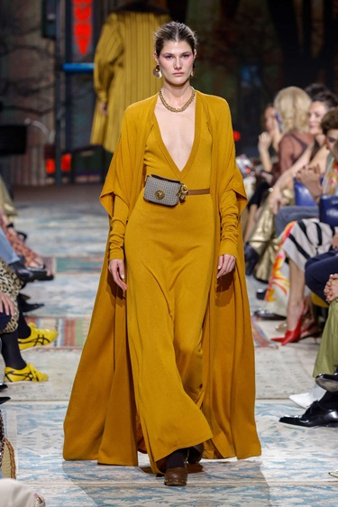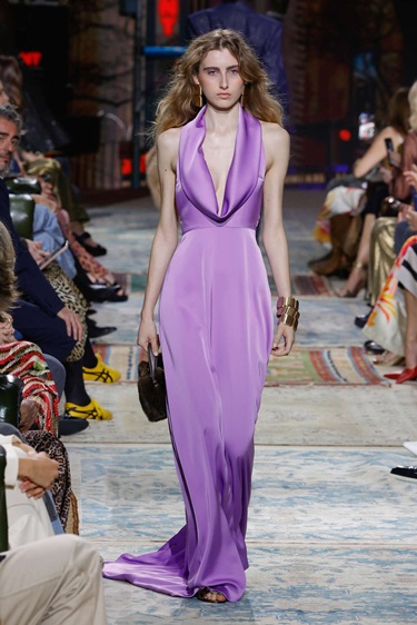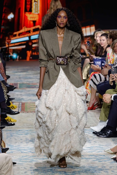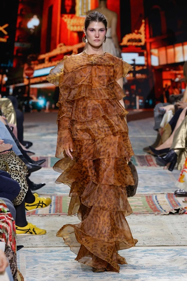 الخامات لعبت دوراً أساسياً في إبراز روح المجموعة، من الأورغانزا والتافتا إلى الترتر والفراء الملمّس، مع تنويع غني في المزج بين المواد لإضفاء عمق بصري ولمسة فاخرة. أما لوحة الألوان فمالت إلى الدرجات الترابية والبرتقالي والاوكر، مع حضور متوازن للأزرق، بينما حافظت النقشات الأيقونية للدار، من الطبعات الحيوانية إلى الزهور والخطوط الكلاسيكية، على هوية واضحة ومعاصرة في آن واحد.