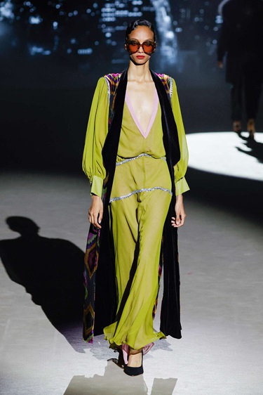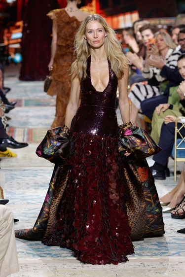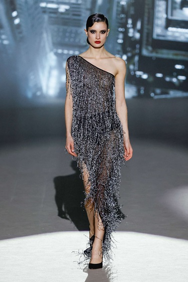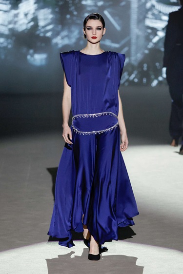 المجموعة توازن بذكاء بين التفصيل الدقيق والطابع الاحتفالي. المعاطف الواسعة والبدلات ذات البنية الواضحة شكّلت أساساً أنيقاً للتصاميم، فيما أضفت الفساتين المستوحاة من أسلوب الفلابر طاقة مفعمة بالحركة من خلال الشراريب الكثيفة والمخمل الفاخر والطبقات الغنية بالخامات. كثير من القطع صُمّم ليبدو أكثر جمالاً أثناء الحركة، وكأنها خُلقت خصيصاً لرقصة أنيقة على إيقاع الجاز. كما لعبت التفاصيل الفاخرة دوراً أساسياً في هوية المجموعة، من التطريزات الكثيفة واللآلئ إلى الريش والأقمشة اللامعة ذات الملمس الغني. لوحة الألوان بدت مشرقة ومليئة بالحياة، ما منح العرض طابعاً احتفالياً يعيد إلى الأذهان أناقة الماضي بروح معاصرة تناسب امرأة اليوم.