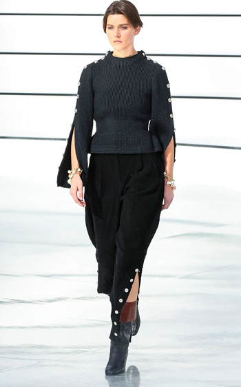 قدّمت فيرجيني أيضاً السترات ذات الحواف الموروبة والسترات القصيرة المستوحاة من راكبي الدراجات النارية، ومعها صممت أيضاً البناطيل الواسعة ذات الخصر العالي والمستوحاة من موضة الثمانينيات.