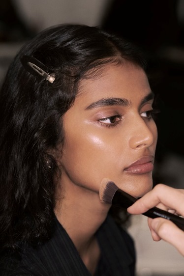 التركيز الأساسي كان على البشرة، حيث أراد بلازي أن تعكس العارضات صورة المرأة التي تعتز ببشرتها وتولي عنايتها اليومية أهمية قصوى. من هنا جاء اختيار مجموعة SUBLIMAGE الشهيرة من شانيل كخطوة تمهيدية أساسية في التحضير. استُخدم مستحضر L’Extrait de Nuit لتجديد الخلايا أثناء الليل، يليه L’Extrait de Crème لتغذية عميقة تمنح البشرة مظهراً ممتلئاً ومشرقاً. أما الشفاه فحصلت على جرعة من العناية عبر L’Extrait Huile Lèvres، قبل أن تأتي لمسات الانتعاش من رذاذ La Brume الذي ثبّت الترطيب وأضفى إشراقة فورية.