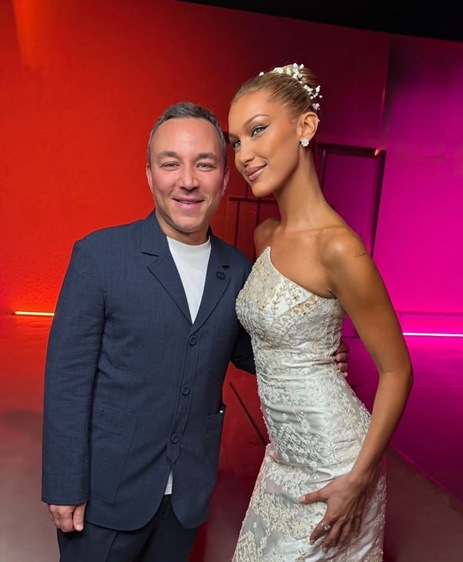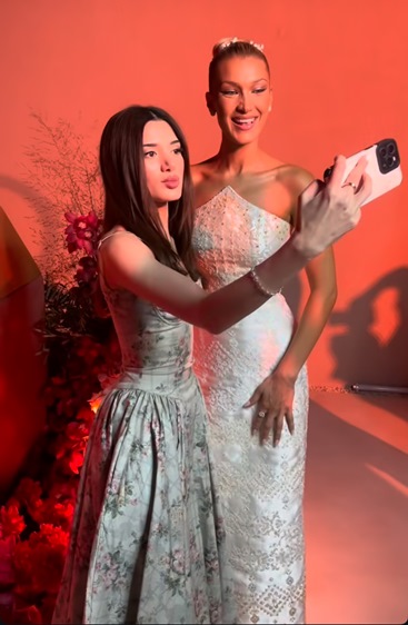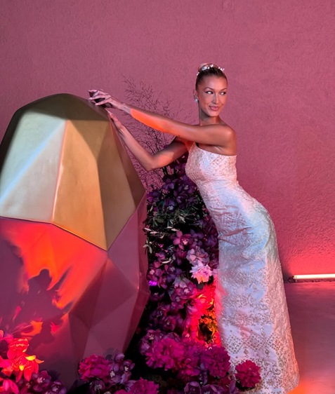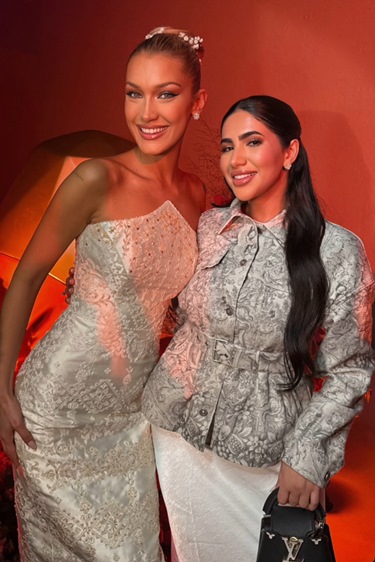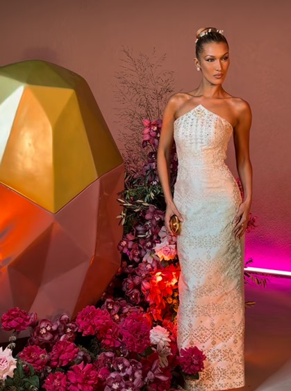 وفي الإطلالة الثانية التي ظهرت فيها بكورسيه بيضاء عارية الكتفني، لفتت بيلا الأنظار بمجوهراتها البرّاقة، حيث تألقت بمجوهرات Imperia Arab Deco من La Marquise Jewellery، إحدى أبرز مجموعات الدار وأكثرها تميزاً. صُممت الأقراط والخاتم من الذهب الوردي الفاخر، وتزيّنا بتوليفة آسرة من الألماس الطبيعي بقَطع الباغيت والمستدير، تتوسطها لمسات من عرق اللؤلؤ المنحوت يدوياً، في تجسيد دقيق لفن العمارة والحرفية الرفيعة التي تشتهر بها الدار. استُلهمت التصاميم من فخامة العمارة العربية ورقيّ أسلوب الآرت ديكو، لتقدّم رؤية حديثة تنبض بالأناقة الكلاسيكية وتعبّر عن الجمال بأسلوب عصري يجمع بين التراث والحداثة. في إطلالة بيلا حديد، تتحوّل المجوهرات إلى قصيدة فنية تفيض نوراً وأنوثة.