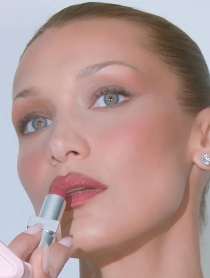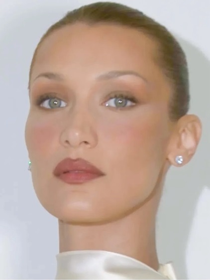 لكن التفاصيل الحقيقية ظهرت في الخدود. استخدام NEW Prada Touch Cream to Powder Blush in P72 Caffe أعطى بيلا ذلك الاحمرار الناعم الذي يبدو طبيعياً جداً، كأن اللون جزء من البشرة نفسها وليس مجرد مستحضر تجميل. وتم تثبيت الإشراقة الخفيفة مع Light Glowing Highlighter Powder in 01 Champagne بطريقة ناعمة وانسيابية جداً.