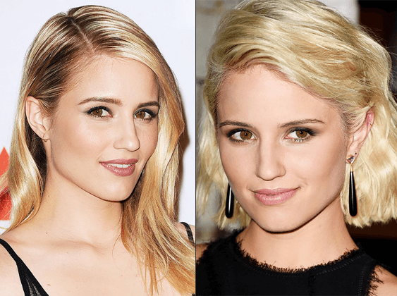ديانا آغرون: تسريحة الشعر القصيرة إلى الكتفين Lob من أكثر تسريحات الشعر رواجاً في عام 2014، لذا اعتمدتها ديانا آغرون بعد احتفاظها بشعرها الطويل لفترة طويلة، لكنها اختارتها بالخصلات المموجة الأمر الذي يظهرها كأنها تصل إلى الأذنين.