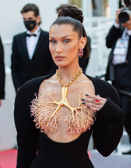 وظهورها هذا العام على السجادة الحمراء لمهرجان كان السينمائي، دفع حديد إلى تجربة مظهر مكياج أكثر جرأة. مع حواجب مستقيمة وحادة ونحيفة للغاية تؤكد أكثر على وجهها المنحوت.