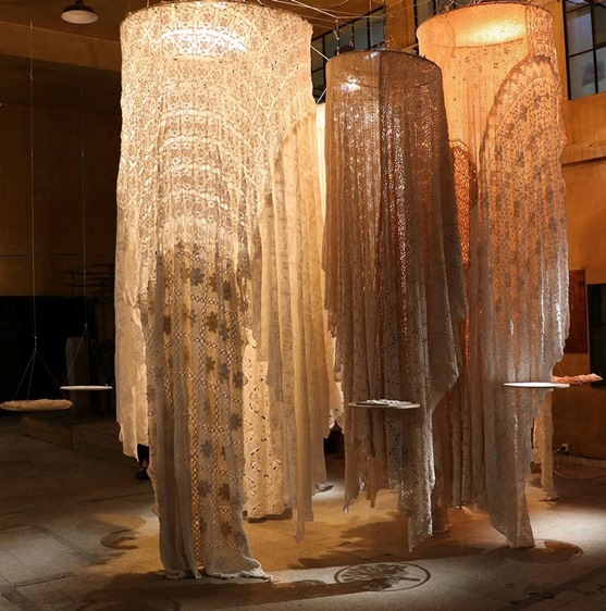 في قلب هذا الحراك، برزت المصممة سارة بيضون، مؤسسة دار Sarah’s Bag، التي اختارت أن تكرّم الحِرف اليدوية النسائية من خلال عمل تركيبي مؤثر بعنوان Hanging by a Thread. العمل يستحضر ذاكرة جهاز العروس اللبنانية القديم، عبر مجموعة من القطع والمنسوجات التي تحكي حكايات أجيال من النساء، لتتحول القطعة الواحدة إلى وعاء للذكريات، وإلى تذكير بقيمة ما يندثر بصمت.