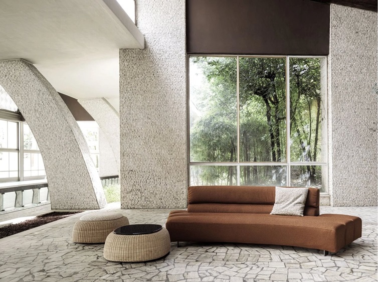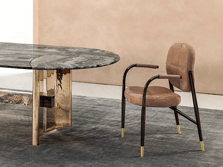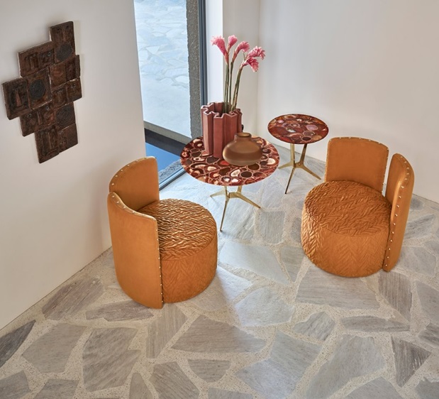 إلى جانب الألوان المشبّعة، تواصل الألوان العنبرية الترابية ترسيخ حضورها في المساحات الداخلية، لما تضفيه من دفء وتوازن. وتحتفي هيسنتيا من كورنيليو كابيليني بهذا التوجّه من خلال تصاميم نحتية ومواد فاخرة، فهي تستند إلى إرثٍ عريق من المهارة الحرفية في منطقة بريانزا. ويعبّر كرسي ذا ليف بذراعين عن هذا الأسلوب، إذ يستلهم تصميمه من شكل أوراق الأشجار، ويأتي مكسوّاً بالكامل بالجلد أو القماش المطرّز، ليمنح القطعة ملمساً بارزاً يوازن بين النعومة والطابع المعماري.