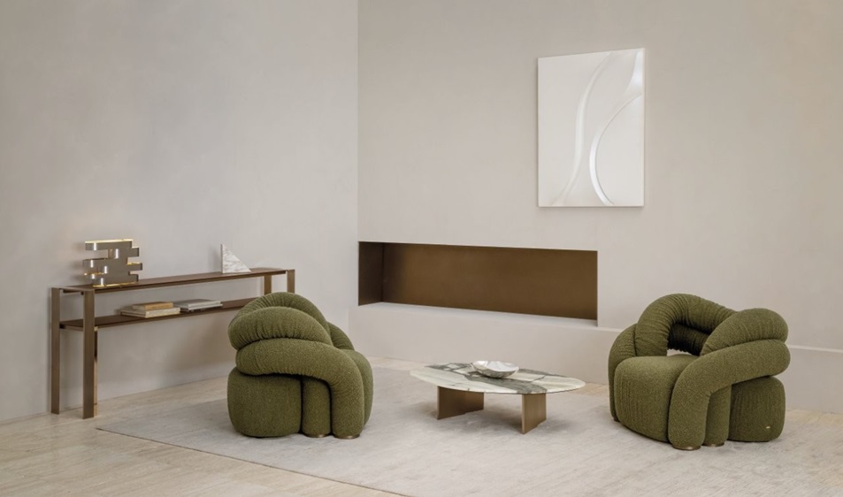 كما تعكس روجانو هذا التوجّه بأسلوبها الخاص الذي يتجلّى في التفاصيل المعدنية النحتية والأناقة المعاصرة، من خلال كرسي سنيك بذراعَين وأريكة سنيك. وبفضل خطوطهما الانسيابية وأحجامهما المتوازنة، تتحوّل هذه القطع إلى عناصر تجمع بين الطابع العملي والجمال النحتي، فتوفّر راحة مدروسة وتمنح المساحة حضوراً مميّزاً.