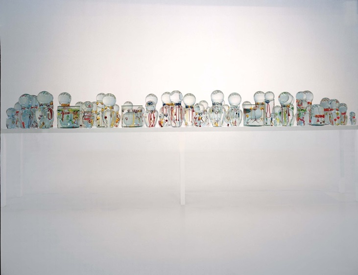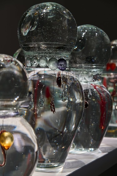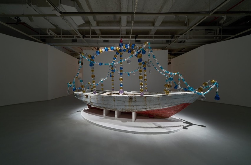 من أبرز الأعمال المعروضة، L?grimas (2002)، حيث تتدلّى قوارير زجاجية مملوءة بالماء كدموع معلّقة في فضاء تأملي، تستحضر أجواء الصلاة والصمت. أما في Le Bateau de Larmes (2004)، فيتحوّل قارب صغير عُثر عليه على سواحل ميامي إلى عمل يحمل دلالات الهجرة والذاكرة، تعلوه خرزات زجاجية مضيئة تعيد صياغة المأساة في قالب من الأمل.