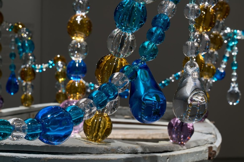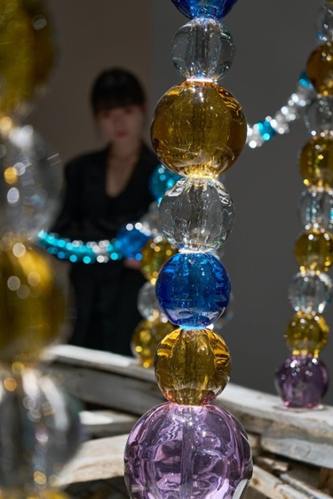 في القاعة الأخيرة، يدخل العملان White Wild Lei (2009) وRivière Rose (2026) في حوار بصري لافت. الأول، عقد ضخم مستوحى من تقاليد هاواي في الترحيب بالغرباء، يحمل أبعاداً روحية مرتبطة بالذاكرة والحضور. أما الثاني، وهو عمل صُمم خصيصاً لهذا المعرض، فيتمدد على الأرض كنهر وردي مضيء مكوّن من قوالب زجاجية مصبوبة يدوياً، ليخلق مشهداً غامراً يدعو الزائر إلى الانخراط في تجربة بصرية قائمة على الضوء والحركة.