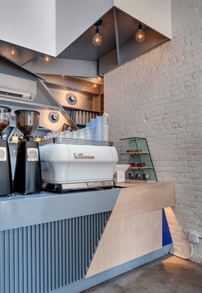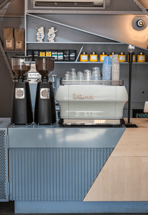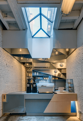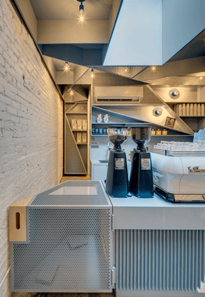 القسم الثالث هو قعر المقهى و يتضمّن المنضدة حيث تعرض الآلات الكهربائية و الحلويات الطازجة. العنصر الأبرز هو الرفوف الحديدية بشكل هندسي جميل، تصميم جذاب يحتلّ الواجهة فيخلق عنصراً دراماتيكياً و يخلق توازناً مع بقيّة المساحة البسيطة.