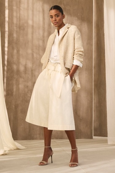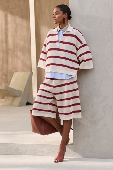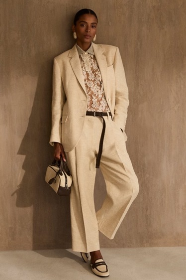 الأرض سيطرت على لوحة الألوان، حيث انعكس ذلك في درجات الرمال والطين والإكرُو الدافئة، مع أنسجة خفيفة من التويد ونقوش الشيفرون الكبيرة التي حملت توقيع الخياطة الإيطالية التقليدية، لكنها مُعادة تفسيرها بروح صيفية خفيفة. أما الهواء، فقد تجسد في هياكل منسوجة مفتوحة، وأقمشة غازية رقيقة، وثقوب دقيقة تشبه الدانتيل، تمنح الملابس إحساساً بالشفافية والحركة، وكأن النسيج نفسه يتنفس ويخاطب العين برقة لا مبالغة فيها.
