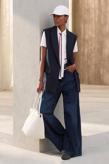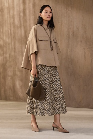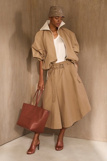 القصّات كانت مريحة ومرنة، من التنانير الطويلة إلى الفساتين الانسيابية والسراويل الواسعة، لتترك حرية الحركة مع الحفاظ على أناقة راقية. وفي مجال الملابس المسائية، قدم كوتشينيلّي فستاناً انسيابياً يتلاشى في شلال من الترتر والريش، يخلق لحظة درامية صامتة تكمل روح المجموعة.