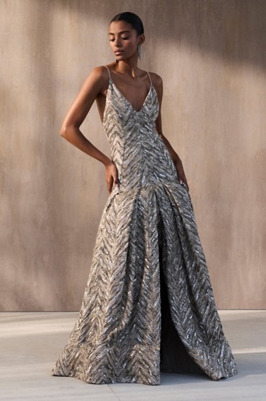 النار جاءت كمفاجأة، بدرجات اللّافا، والروبارب، والطوب الناري، لتضيف جرعة من الحيوية في سترات وقمصان قصيرة من الجلد السويدي، محدثة تبايناً لطيفاً مع لوحة الأرض الهادئة، من دون أن تسيطر على التوجه العام للمجموعة. بالمقابل، الماء تجسد في الأقمشة المتلألئة باللون الأزرق واللون البحري الرغوي، مزينة بتطريزات تشبه الأصداف، وملمس متموج يحاكي الأمواج، مع فساتين مرصعة بالترتر لتعكس ضوء البحر. من أبرز القطع، فستان قصير مغطى بالأصداف المتلألئة، الذي جمع بين الفخامة والرقة في آن واحد.