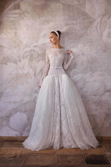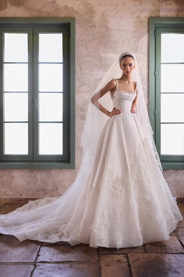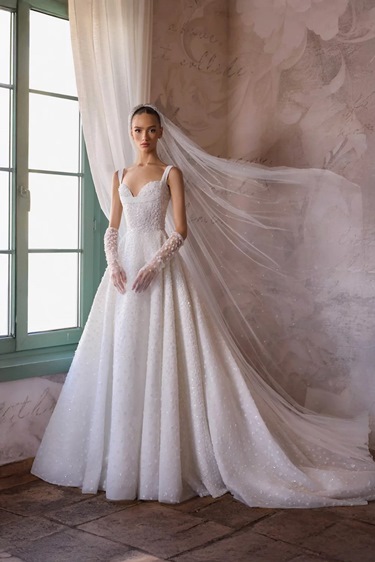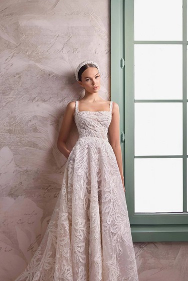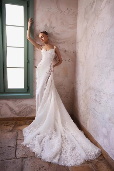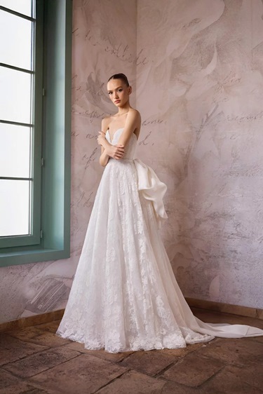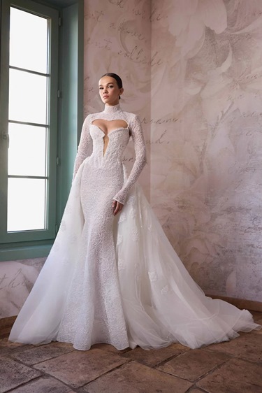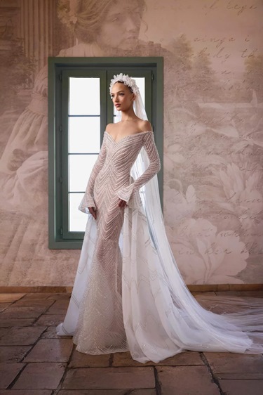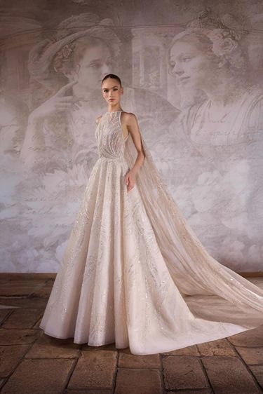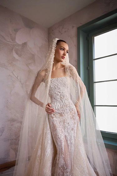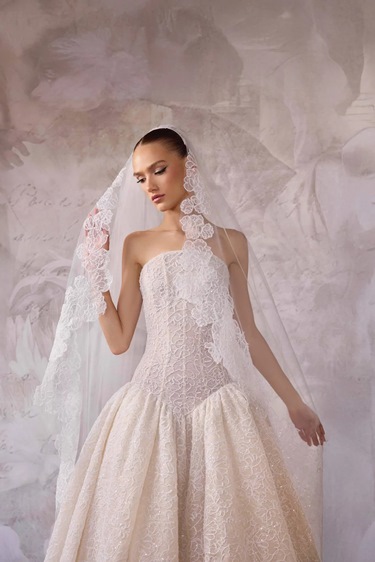 المجموعة مشبعة بإيحاءات الزهور، لكن من دون مبالغة زخرفية. الدانتيل يوضع بحساب، ليعانق الجسد ويمتد مثل أغصان رفيعة على الصدر والخصر قبل أن يذوب بخفة داخل التنورة. الكورسيه المنحوت يمنح القوام بنية واضحة، لكنه لا يقسو عليه، إذ يجاوره تول شفاف وطبقات خفيفة تمنح الحركة انسيابية تجعل الفستان يتنفس مع العروس. اللؤلؤ حاضر كهمسة، لا كصرخة، يلتقط الضوء برفق ويحتفظ بروح القرب والحميمية.