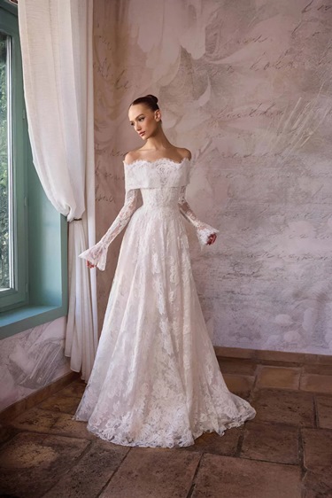 لوحة الألوان تميل إلى الأوف وايت وتدرجاته الصامتة، فتُفسح المجال للملمس ليقود المشهد. نحن أمام حوار بين دانتيل مطفأ وبريق لؤلؤ خفيف، بين طبقات شفافة وبنية معمارية ناعمة، ينتج عنه تأثير بصري عاطفي من دون مبالغة أو استعراض.