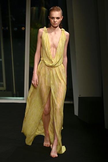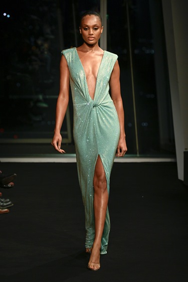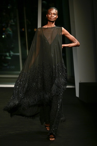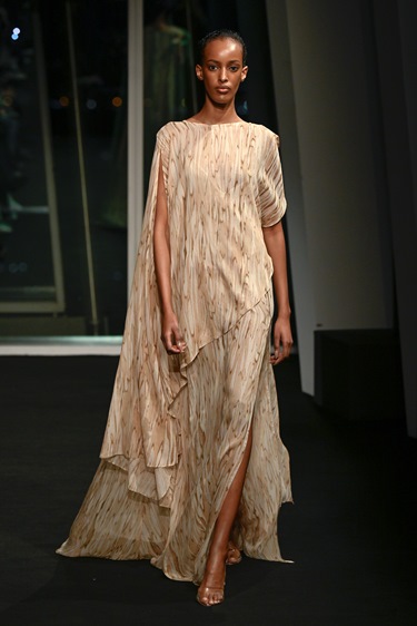 الشيفون المقصوص على bias cut منح القطع خفة حسّية، إذ تمايلت الأقمشة مع كل خطوة، بينما لعبت الشقوق العالية دوراً في إبراز الساقين من دون الوقوع في فخ الابتذال. اللافت أن ما بدا على الحافة بين الجرأة والمبالغة، تم ترويضه عبر درابينغ ذكي يلتف حول الخصر والوركين ليعيد التوازن البصري. هناك فهم عميق لتشريح الجسد؛ كل فتحة، كل انحناءة، وكل تقاطع قماش بدا وكأنه مرسوم ليبرز المنحنيات لا ليغطيها فقط.
