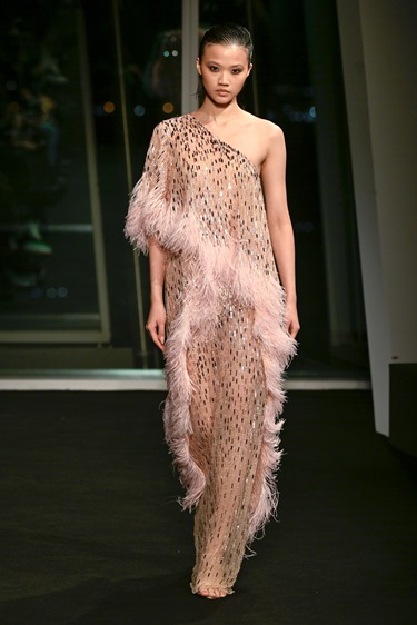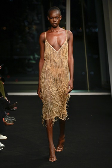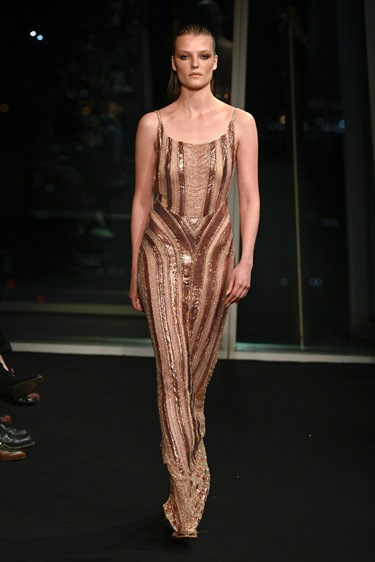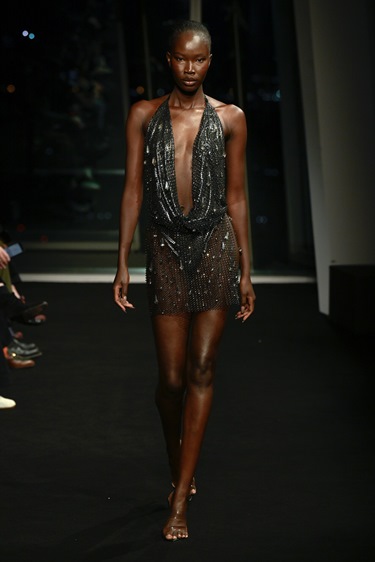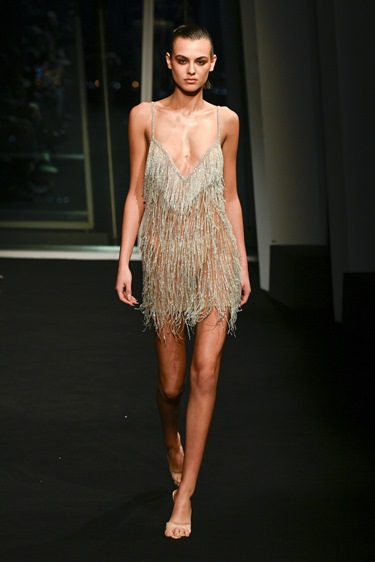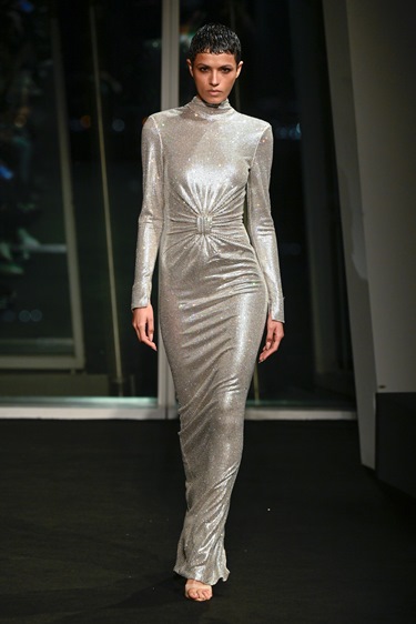 لطالما لُقّب بـ"فيرساتشي الويلزي"، وفي هذه المجموعة أعاد ترسيخ هذا اللقب عبر فساتين سهرة مشغولة بجرعة عالية من الإغراء الأنغلوسكسوني. الترتر كان البطل الأول: فساتين طويلة بالكامل منسوجة بخيوط معدنية عاكسة للضوء، تتحرك مع الجسد كما لو أنها موجات فضية. بعض التصاميم جاءت بقصّات ضيقة للغاية، تنسدل على القوام بانسيابية محسوبة، فيما كادت أخرى تنزلق عن الأكتاف لتكشف عن عظام الترقوة بجرأة مدروسة.