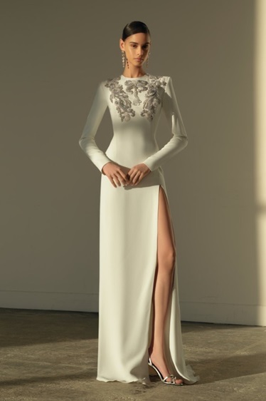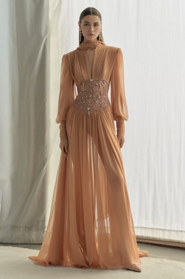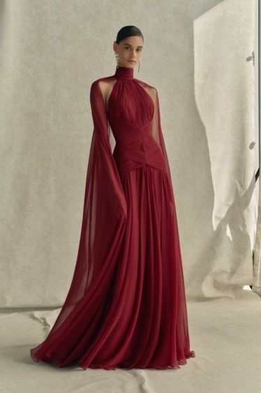 في فساتين السهرة، اتجه مراد نحو درابيهات معقدة وبنية غنية بالأقمشة. طبقات متعددة من التول والحرير تشابكت لتشكّل حجماً ناعماً حول الجسد، بينما أضافت الترتر اللامعة إيقاعاً ضوئياً واضحاً. بعض الفساتين كشفت عن شقوق طويلة في التنورة، ما منح الحركة حضوراً لافتاً مع كل خطوة.