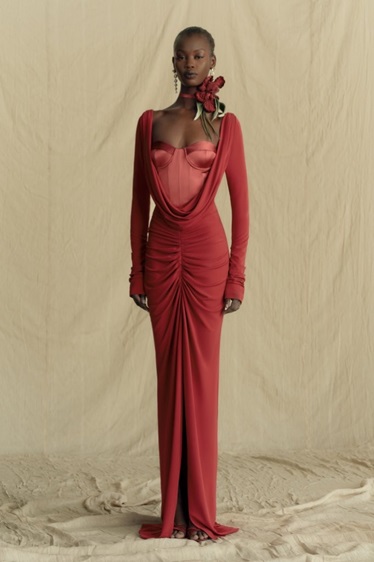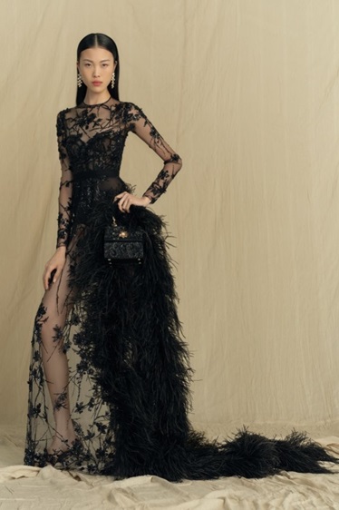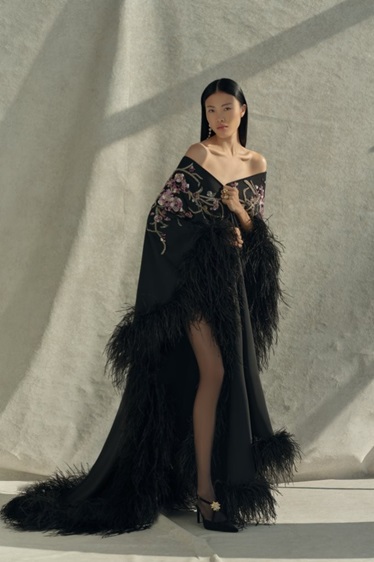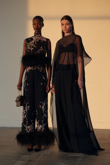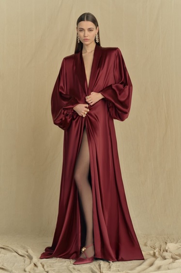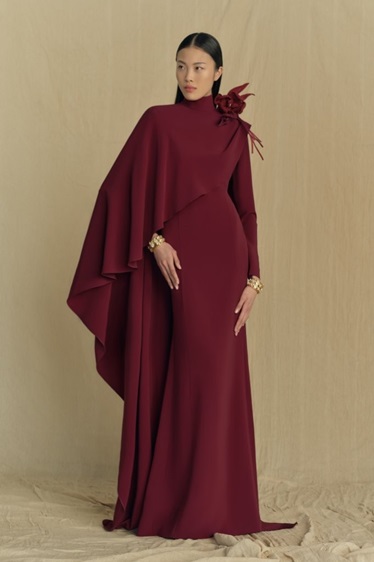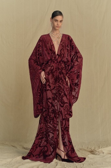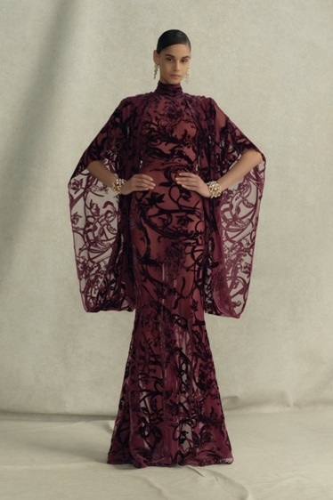 اللافت في المجموعة حضور الأقمشة المتباينة التي خلقت حواراً بصرياً داخل الإطلالة الواحدة. الدانتيل الشفاف أضيف فوق خامات أكثر صلابة مثل الصوف، ما منح القطع بعداً حسياً واضحاً. أما المخمل المحروق فكان أحد أبرز عناصر المجموعة، إذ تحرك مع الضوء ليكشف انعكاسات شبه شفافة تضفي عمقاً بصرياً على الفساتين والعباءات.