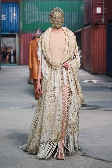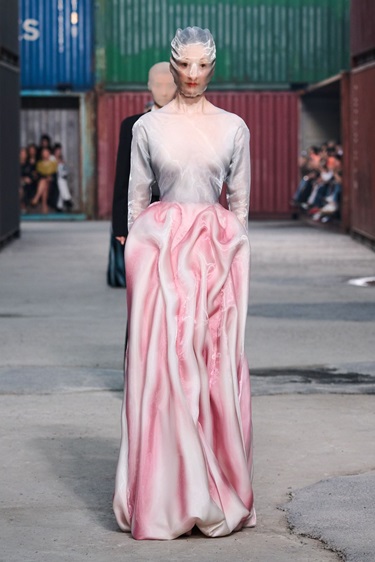 فتحت سماء مضاءة بتوهّج ذهبي، تقدّمت العارضات بخطوات مدروسة ووجوه مغطاة بالأقنعة، على وقع موسيقى أعادت صياغة أغنية Where the Wild Roses Grow بشكل شاعري وغامض. لم تكن الأزياء صامتة، بل أصدرت همسات خفيفة من احتكاك الخامات غير التقليدية، في تجربة حسّية تضيف بعدًا سمعيًا إلى العرض.