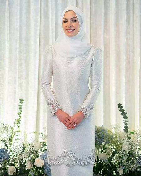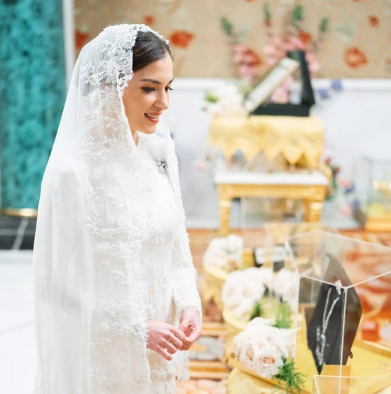 - تألقت أنيشا عيسى بإطلالة زفاف أخرى إذ ارتدت فستانًا من الدانتيل الأبيض مع طرحة طويلة تزدان بالدانتيل ومجوهرات من الألماس واللؤلؤ خلال تلقي الهدايا من العائلتين والأصدقاء، وضمت هذه الهدايا العديد من قطع المجوهرات الفاخرة المرصعة بالألماس والأحجار الكريمة احتفالًأ بزفافهما الملكي.