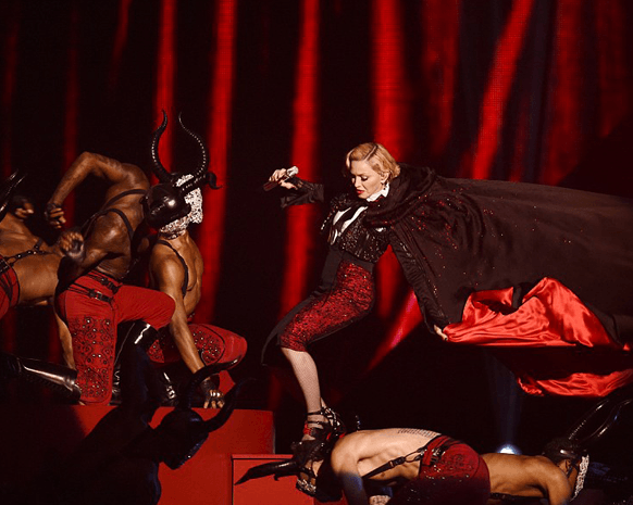 أثناء تأديتها لأغنيتها Living For Love على مسرح جوائز Brit، وقعت المغنية الأكثر شهرة في العالم مادونا Madonna حين كانت تفك عقدة الكاب الذي ترتديه و الذي سحب منها قبل أن تنتهي من فكه فسحبت معه إلى الخلف ووقعت عدة درجات وسقطت أرضاً على ظهرها، فيما ساعدها الراقصون على الوقوف من جديد.