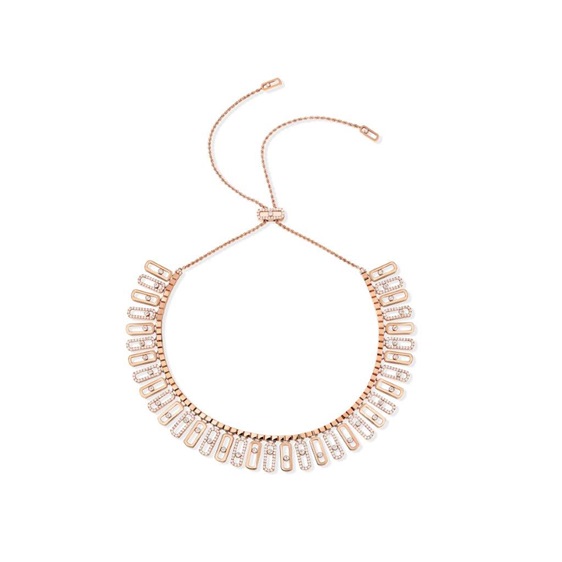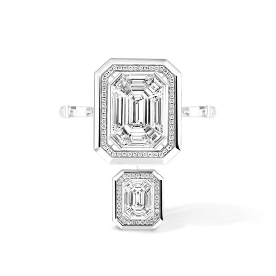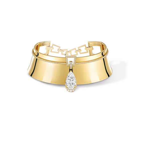 تتّسم تصاميم فاليري ميسيكا بهيكليّتها الفائقة، بحيث الصلابة الظاهرة للتصميم تُفسح المجال أمام مرونة الحركة. وهكذا يُمكن ارتداء هذه القطعة القابلة للتحوّل بثلاث طرق: كعقد مرصّع بالحجر لإطلالة حازمة، أو بدون الحجر لإطلالة بعيدة عن التكلّف، أو كخاتم مزدوج لإضفاء لمسة من البريق إلى الإطلالة.