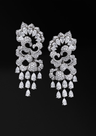 ويكتمل هذا الثلاثي المتألق من المجوهرات بزوج من الأقراط ذات أشكال حلزونية تشبه الدانتيل- الذي يعتبر بصمة مميزة لعلامة شوبارد تتواجد أيضاً في تفاصيل الطوق المذكور سابقاً. صنعت الأقراط من الذهب الأبيض الأخلاقي عيار 18 قيراط، ورصّعت بأكثر من 10 قيراط من الألماس بقطع كمثري وقطع بريليانت، ويلتف تصميمها حول الأذن برقّة قبل أن يفسح المجال لسلاسل ناعمة من الألماس الكمثري القطع لتتدلى منها كقطرات من الضوء، فتتلألأ كما لو كانت تتساقط برفق من الأذن وتشرق على من ترتديها ببريقها المتقد.