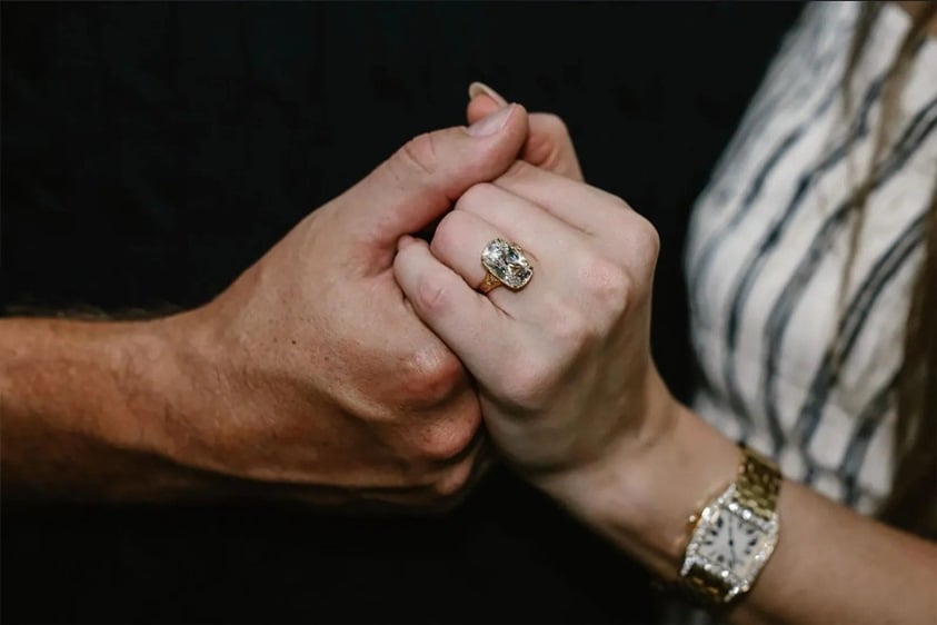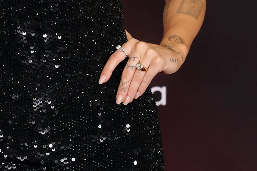 ظهرت مايلي سايرس بخاتم خطوبة من Jacquie Aiche بعيار 14 قيراطاً من الذهب الأصفر مع حجر ألماس cushion-cut بوضعية أفقية. الخاتم بالأسلوب الغجري منح التصميم إحساساً بوهيمياً يعكس شخصيتها الجريئة. هذا النوع من الخواتم يرسخ اتجاهاً نحو الخاتم الذي يبدو كقطعة مجوهرات يومية فاخرة، لا مجرد خاتم مناسبات.